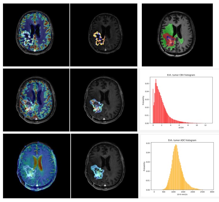 This sophisticated technique allows for a comprehensive assessment, measuring the dimensions of lesions in 2D and 3D and identifies different areas of enhancing lesions, edema, and necrosis. The analysis extends beyond structural insights, incorporating a wide array of biomarkers, including diffusion and perfusion metrics as well as parametric response maps.